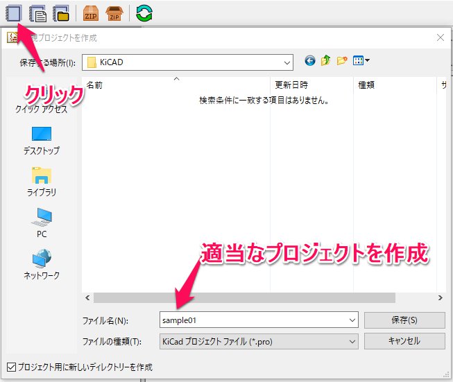 - KiCad5を起動し、新規プロジェクトを作成アイコンをクリックし、まずは適当なプロジェクトを作成します。