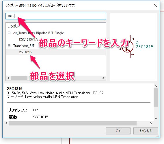 - そうしますと、シンボルを選択ダイアログが出ます。検索窓で配置したい部品のキーワードを入力しますと、