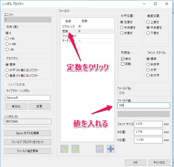 - シンボルプロパティの画面が開きます。フィールドの定数をクリックし、右下のフィールド値に値を入れます。