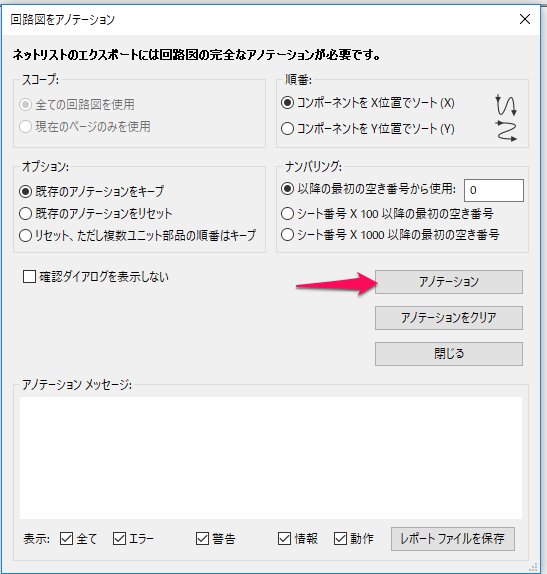 - 部品に番号が振られます。これはプリント基板を作成するときに必要ですので、部品を追加削除した場合、必ず再実行し、番号を振りなおしましょう。
