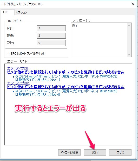 - 実行をクリックします。回路図におかしなところがあると、ここでエラーが出ます。ここでは電源入力ピンが宙に浮いているとエラーになっています。