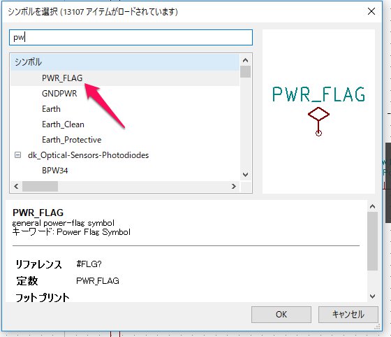 - KiCadでは、電源ピンは電源であることを示すシンボルを配置する必要があります。このシンボルは「PWR_FLAG」といいます。
