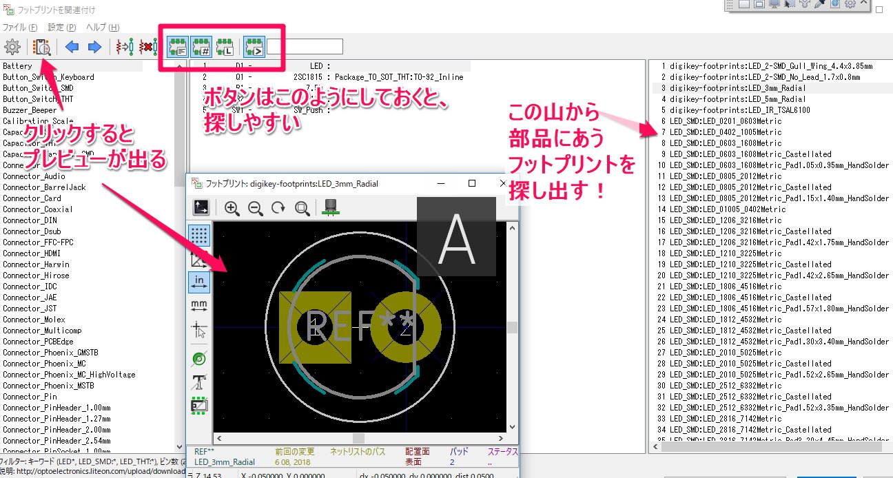 - 次に、プリント基板を描いていくのに必要なフットプリント(ようはプリント基板に描く穴の位置や部品の形など)と、回路図上の部品(シンボル)を対応付けしていく作業を行います。