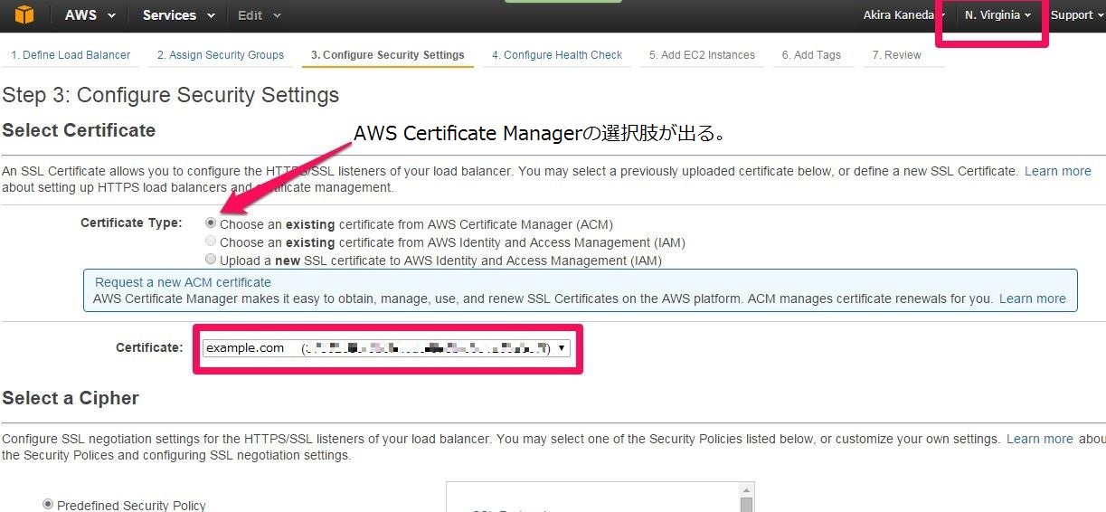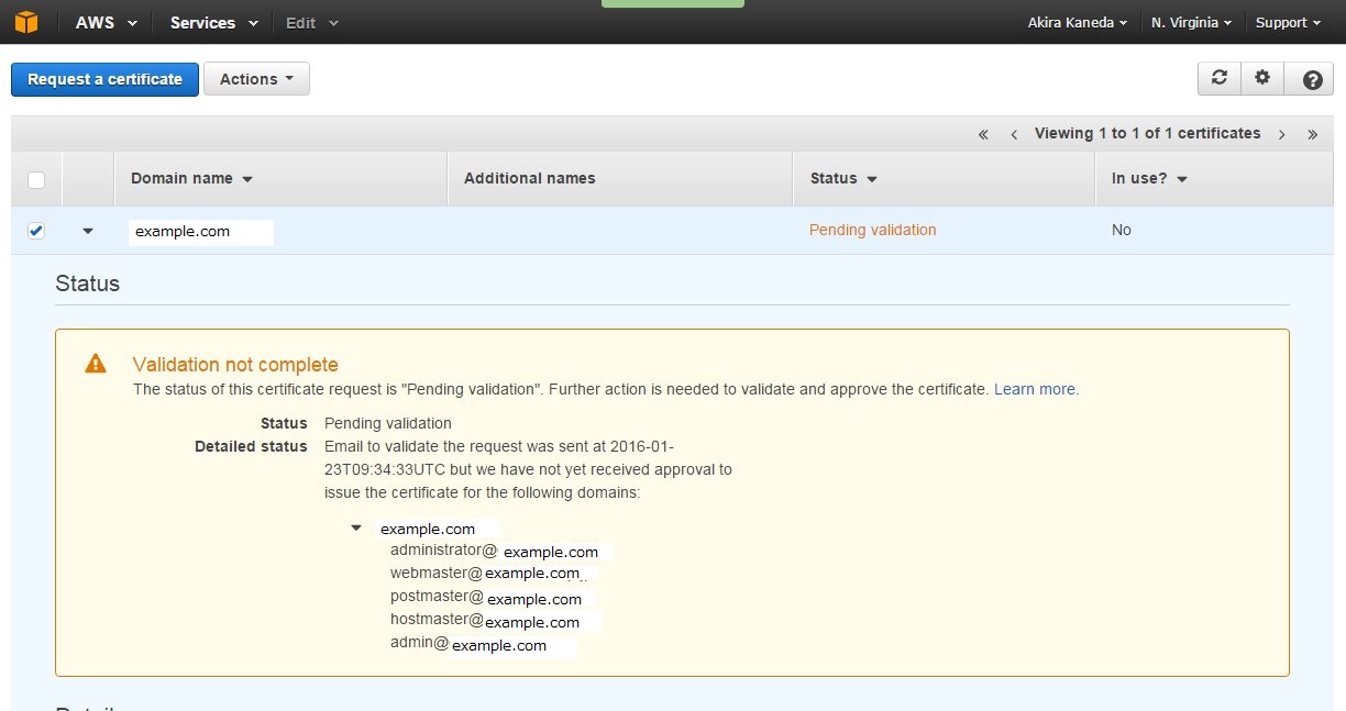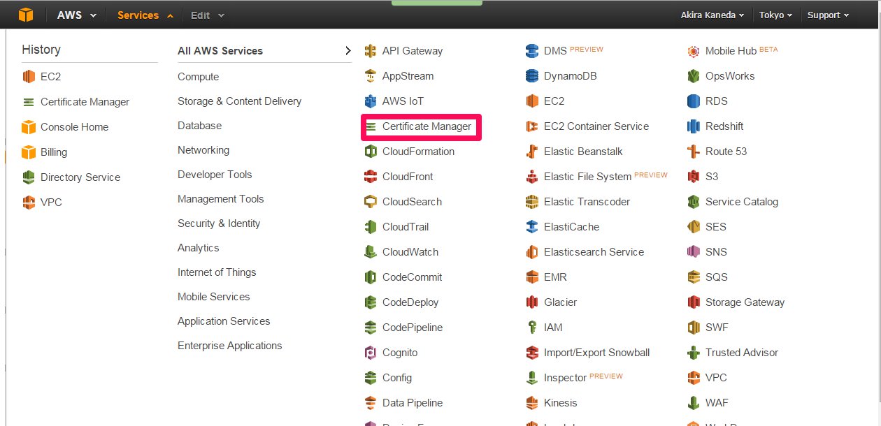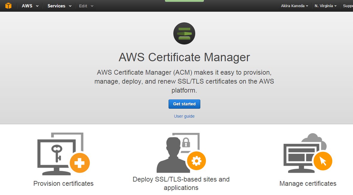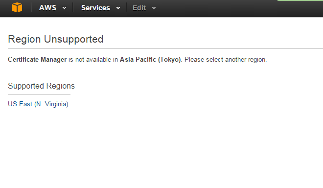 注意点として、今のところ同一リージョンでしか使用できません。つまり、今回作成した証明書は東京リージョンのELBには使用できません。(現在は東京リージョンが提供されています。)