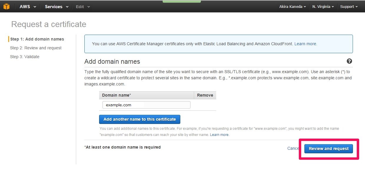 複数のドメインを登録したい場合は下のAdd another name to this certificateボタンを押すと、