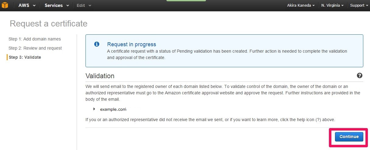 - ドメインの持ち主か確認するためにメールを送るよ。という画面が出ます。Continueボタンを押します。