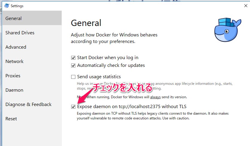 - Docker for Windowsの設定画面を開き、Expose daemon on tcp://localhost:2375 without TLSにチェックを入れます。