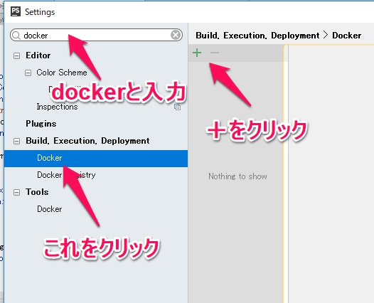 - 検索窓にdockerと入力します。Build.Exection.Deploymentの下にあるDockerをクリック。右側のウインドウ上部にある「+」をクリックします。