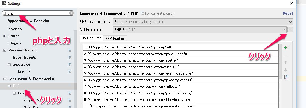 Virtual machine pathは不要なので、「-」をクリックして消しておきます。 - 次に設定の検索窓にphpと入力します。Languages & Frameworksの下にあるPHPをクリックします。
