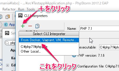右側のCLI Interpreterの端にある「…」ボタンをクリックします。 - 「+」をクリックし、From Docker. Vagrant. VM Remoteをクリックします。
