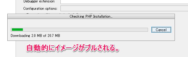 ここでは公式イメージを入れていますが、実際にはxdebug込みや必要なエクステンションが入ったイメージを指定するほうがよいでしょう。 - 自動でイメージがプルされます。