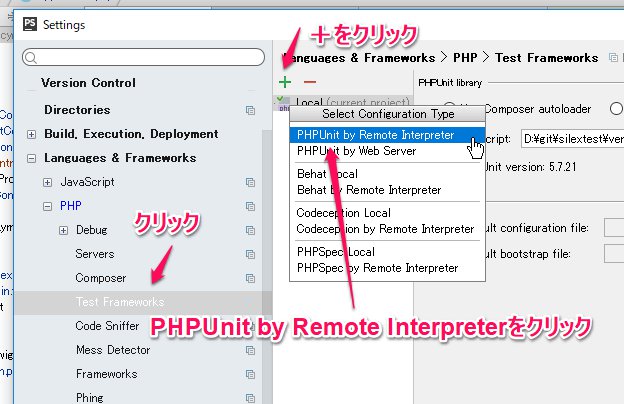 - 次にPHPUnitの設定を行います。TestFrameworksをクリックし、「+」をクリック。PHPUnit by Remote Interpreterをクリックします。