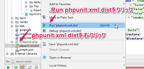 - プロジェクトから、phpunit.xml.distを右クリックし、Run phpunit.xml.distをクリック。PHPUnitを走らせます。