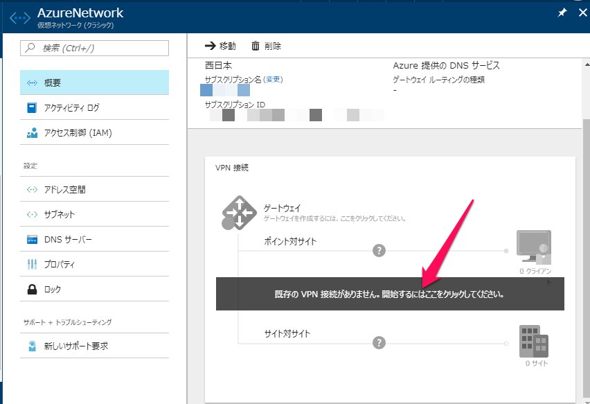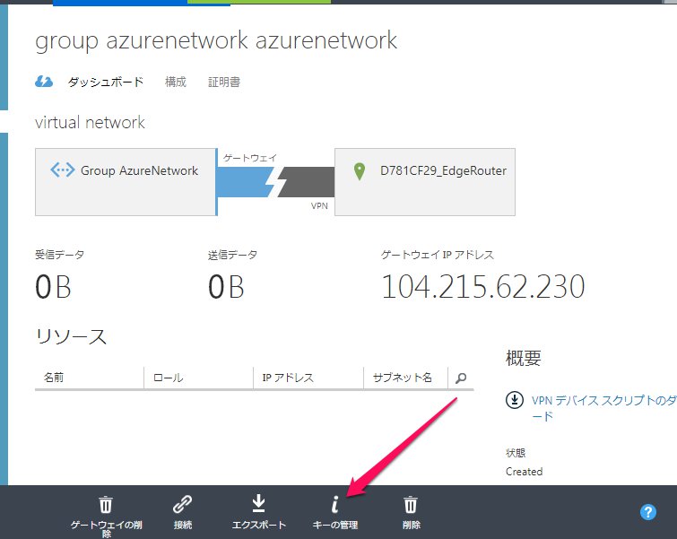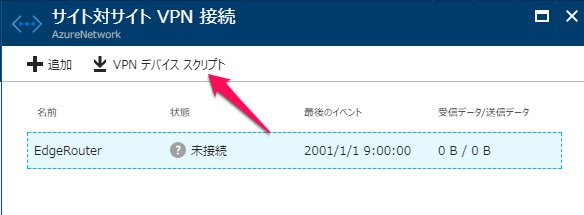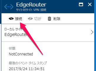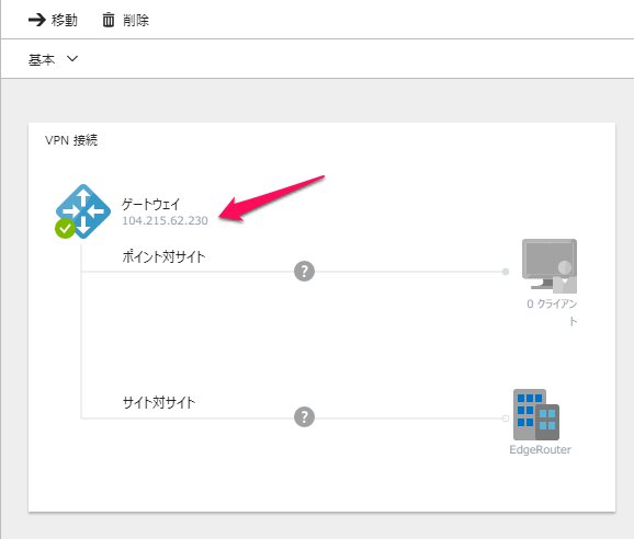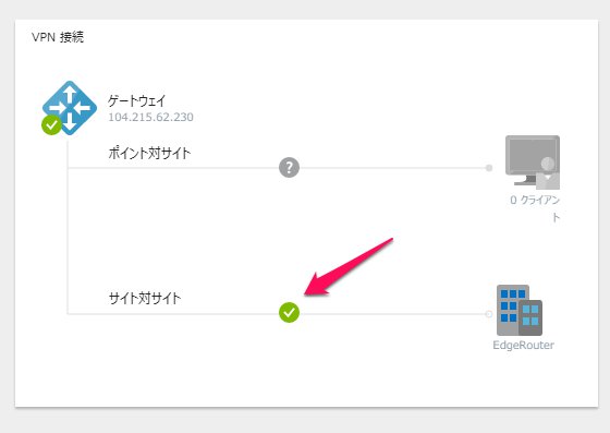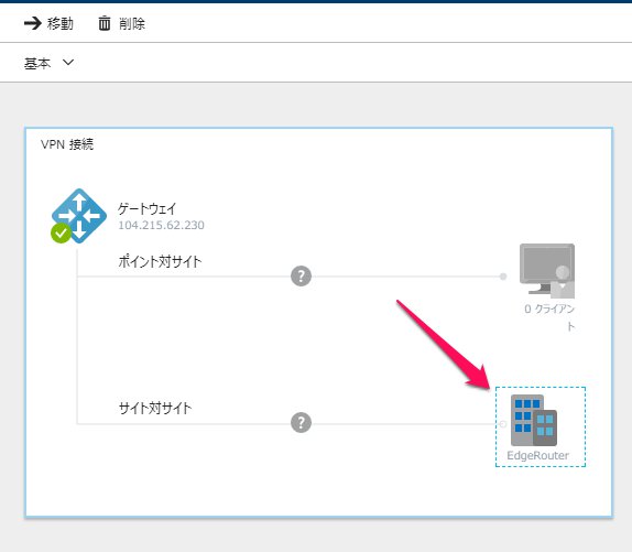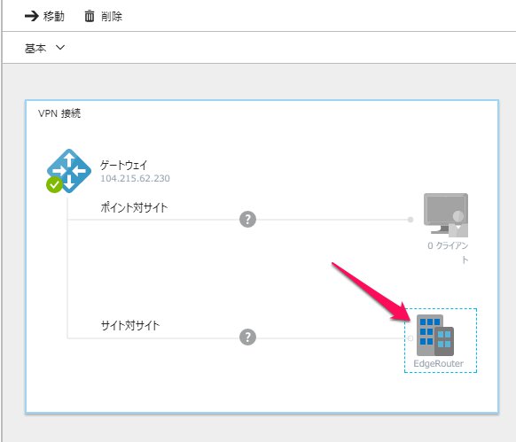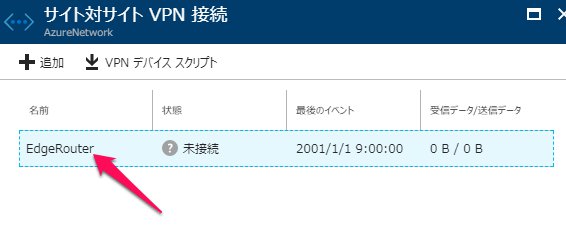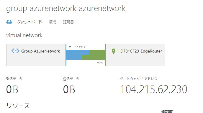 Azureコンパネ上ではこのようになります。 旧ポータルだとわかりやすく表示されます。 EdgeRouterからAzure内にある仮想マシンにPINGを飛ばしてみます。ubnt@ubnt:~$ ping 10.0.0.4 PING 10.0.0.4 (10.0.0.4) 56(84) bytes of data. 64 bytes from 10.0.0.4: icmp_req=1 ttl=63 time=19.5 ms 64 bytes from 10.0.0.4: icmp_req=2 ttl=63 time=20.4 ms 64 bytes from 10.0.0.4: icmp_req=3 ttl=63 time=20.2 ms 64 bytes from 10.0.0.4: icmp_req=4 ttl=63 time=19.4 ms 64 bytes from 10.0.0.4: icmp_req=5 ttl=63 time=19.9 ms