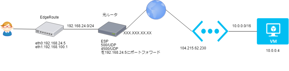 # set vpn ipsec ipsec-interfaces interface eth0 # set vpn ipsec auto-firewall-nat-exclude enable # set vpn ipsec nat-traversal enable # set vpn ipsec esp-group esp-azure compression disable # set vpn ipsec esp-group esp-azure lifetime 3600 # set vpn ipsec esp-group esp-azure mode tunnel # set vpn ipsec esp-group esp-azure pfs disable # set vpn ipsec esp-group esp-azure proposal 1 encryption aes256 # set vpn ipsec esp-group esp-azure proposal 1 hash sha1 # set vpn ipsec ike-group ike-azure key-exchange ikev2 # set vpn ipsec ike-group ike-azure ikev2-reauth no # set vpn ipsec ike-group ike-azure lifetime 28800 # set vpn ipsec ike-group ike-azure proposal 1 dh-group 2 # set vpn ipsec ike-group ike-azure proposal 1 encryption aes256 # set vpn ipsec ike-group ike-azure proposal 1 hash sha1 # set vpn ipsec site-to-site peer 104.215.62.230 description Azure # set vpn ipsec site-to-site peer 104.215.62.230 authentication mode pre-shared-secret # set vpn ipsec site-to-site peer 104.215.62.230 authentication pre-shared-secret <共通パスワード> # set vpn ipsec site-to-site peer 104.215.62.230 connection-type initiate # set vpn ipsec site-to-site peer 104.215.62.230 default-esp-group esp-azure # set vpn ipsec site-to-site peer 104.215.62.230 ike-group ike-azure # set vpn ipsec site-to-site peer 104.215.62.230 ikev2-reauth inherit # set vpn ipsec site-to-site peer 104.215.62.230 local-address any # set vpn ipsec site-to-site peer 104.215.62.230 tunnel 1 allow-nat-networks disable # set vpn ipsec site-to-site peer 104.215.62.230 tunnel 1 allow-public-networks disable # set vpn ipsec site-to-site peer 104.215.62.230 tunnel 1 esp-group esp-azure # set vpn ipsec site-to-site peer 104.215.62.230 tunnel 1 local prefix 192.168.100.0/24 # EdgeRouteのLAN側サブネット # set vpn ipsec site-to-site peer 104.215.62.230 tunnel 1 remote prefix 10.0.0.0/16 # Azure側のサブネット