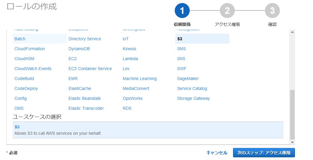 S3へのアクセスは権限がないので拒否されています。