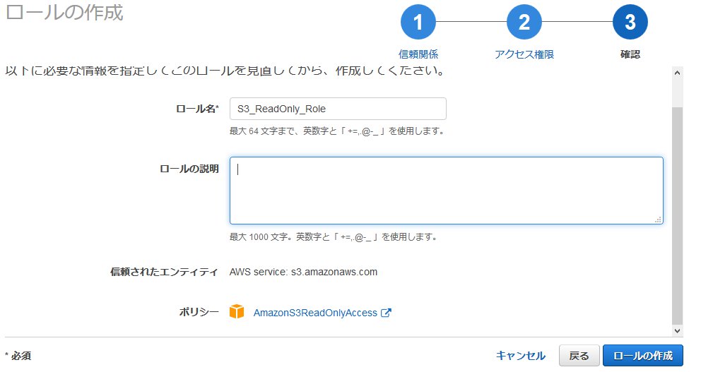 先ほどのIAMロールから、AmazonS3ReadOnlyAccessポリシーを削除し、