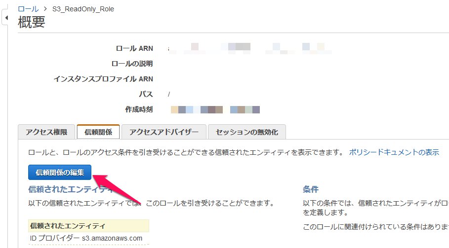 信頼関係タブから信頼関係の編集をクリックします。 Principalの箇所を以下のように変更します。{ "Version": "2012-10-17", "Statement": [ { "Effect": "Allow", "Principal": { "AWS": "<作成したdeveropのARN>" }, "Action": "sts:AssumeRole" } ] }以上で準備は完了です。