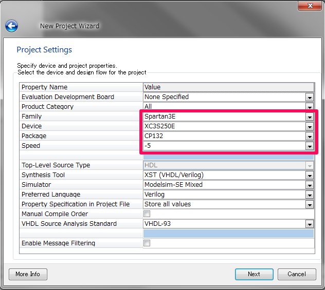 - Project Settingでは、本ボード(BASYS2)に搭載されているデバイス、パッケージなどを設定します。