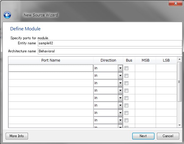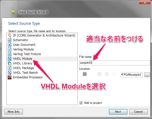 - 追加するソースファイルを設定します。ここではVHDLを追加するので、Source TypwにはVHDL Moduleを選択し、適当な名前をつけます。