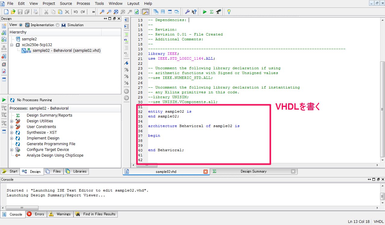 Generate Programming Fileをダブルクリックします。 - ガリガリと論理合成などが走ります。最終的にConsoleにエラーが出ず、"Process Generate Programming File completed successfully"と出ればOKです。