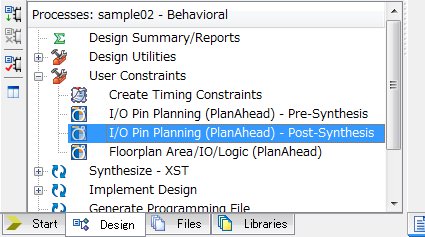 といいても、単純にスイッチのbitに対応する7SegのH/Lを書いただけです。 - 書き終えましたら、UserConstraintsの左端の+をクリックして展開し、その中にあるI/O Pin Plannning(PlanAhead)-Post-Synthesisをクリックします。