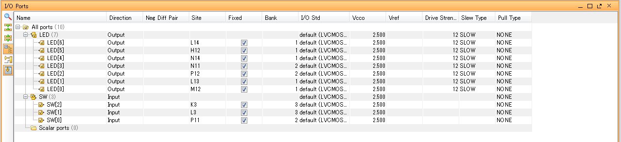 - ここでは、サンプルとして、スイッチからの3bit入力に対応する10進数を7SegLEDに表示するコードを書きます。