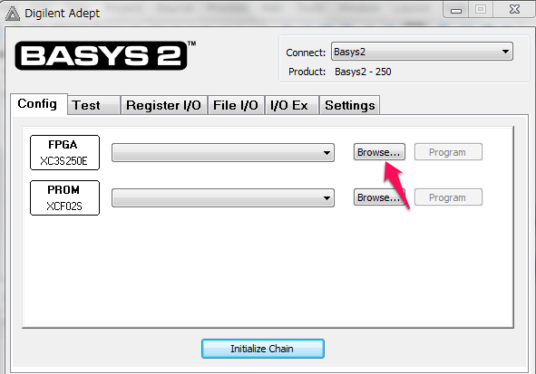 - BASYS2に書き込むためのソフトである、DigilentAdeptを起動し、Configタブより、FPGAに先ほど作成したbitファイルを読み込ませます。