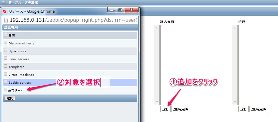 次に[権限]をクリックします。 - [読取専用]の下にある[追加]ボタンをクリックします。ポップアップで表示された中から、対象サーバグループを選択します。