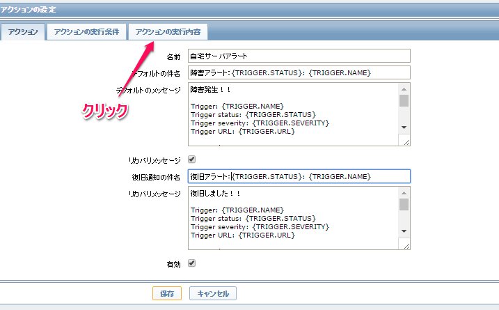 設定が終わったら忘れず一番下の[追加]リンクをクリックします。 - このように、アクションの実行内容に追加されます。保存ボタンをクリックします。