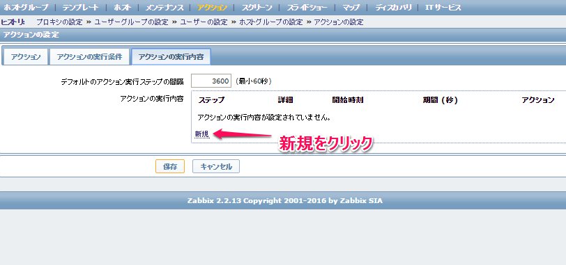 [アクションの実行内容]タブをクリックします。 - [アクションの実行内容]タブより、[新規]リンクをクリックします。